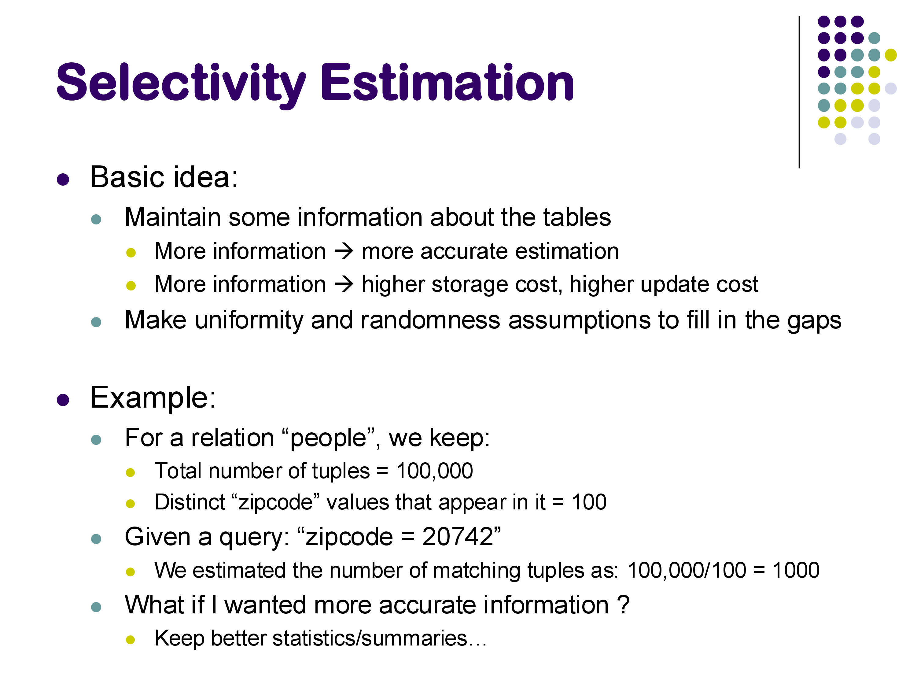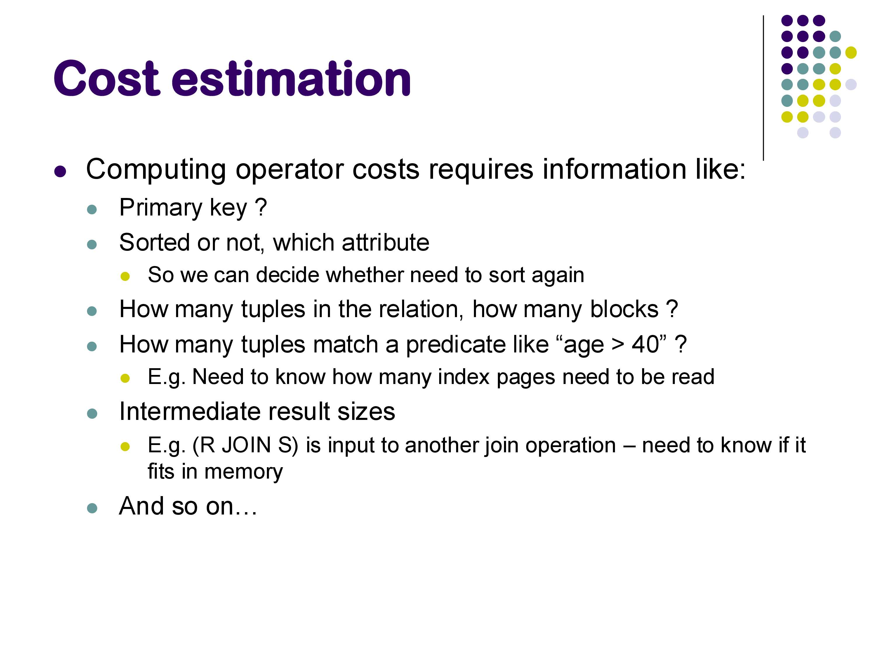 Intermediate result size estimation: what is the size of the output of each operator in the plan tree? This is the harder part, and it is the focus of these notes.