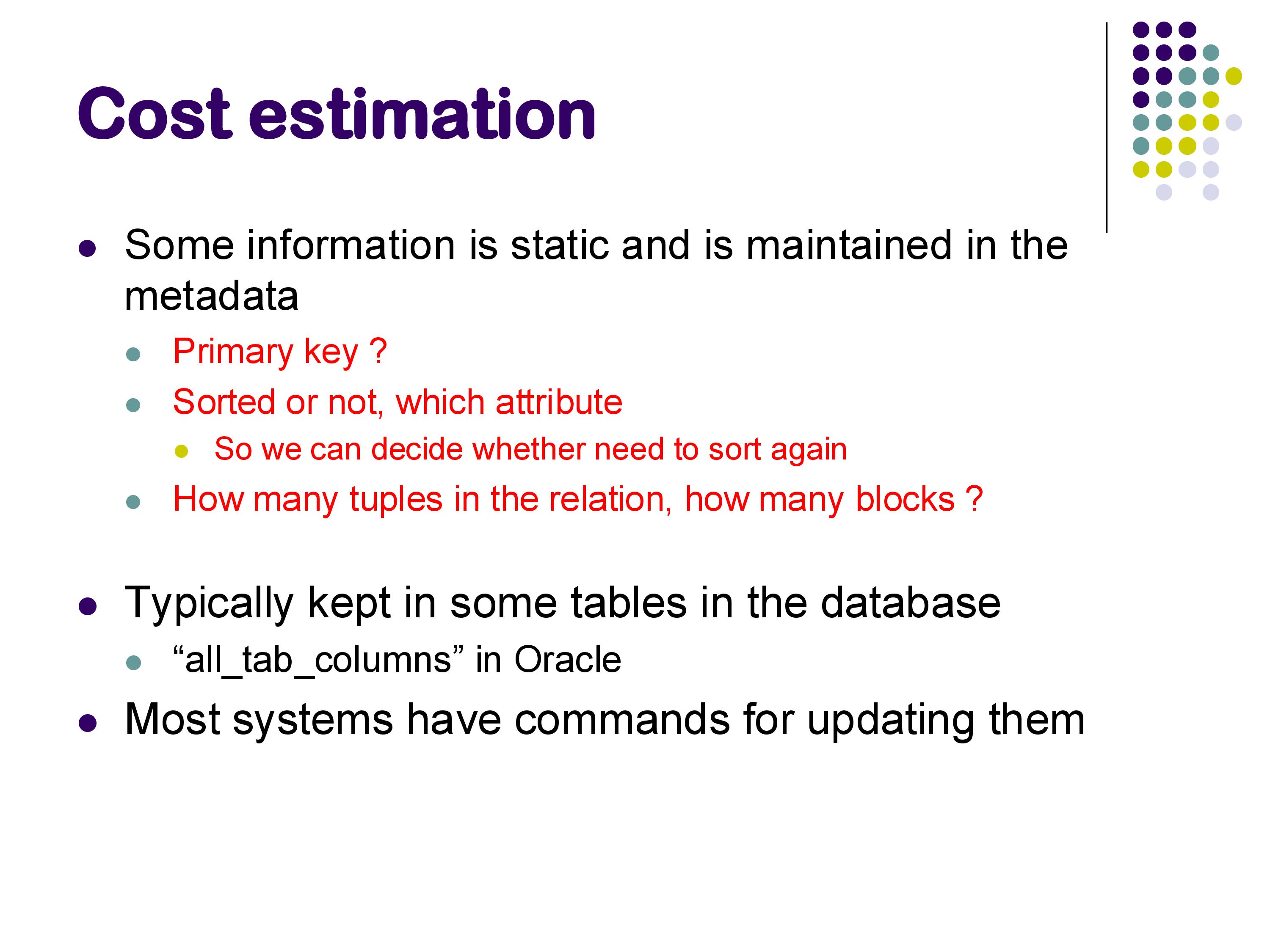 - Maintain per-relation statistics in system tables: tuple count, block count, V(A, r), MAX, MIN, NULL fractions.