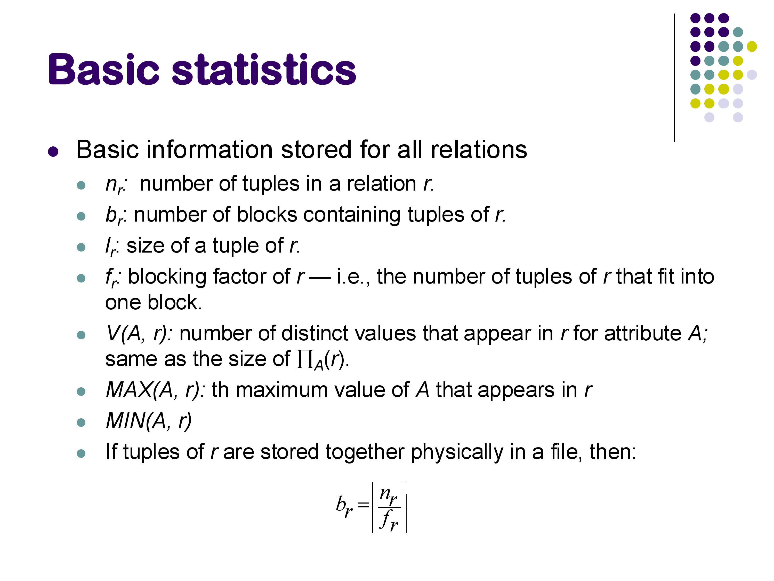 | \(f_r\) | blocking factor: tuples per block; \(b_r = \lceil n_r / f_r \rceil\) |