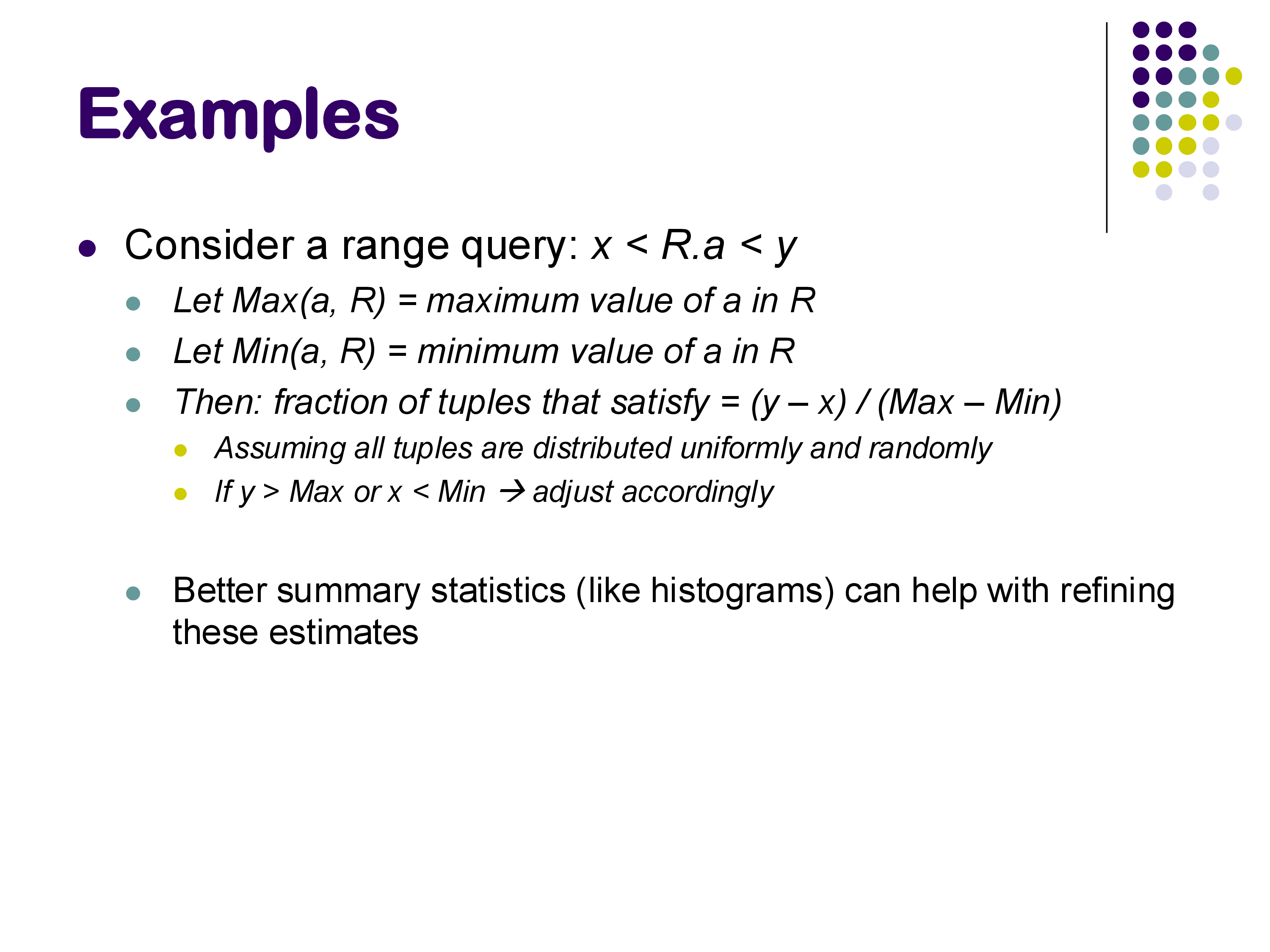 The approach universally used in practice: maintain a set of pre-computed statistics about each relation, and use those statistics together with simplifying assumptions (primarily: uniformity — values are distributed evenly across their range) to estimate result sizes. The more statistics we maintain, the more accurate our estimates — at the cost of more storage and more work to keep them up to date.