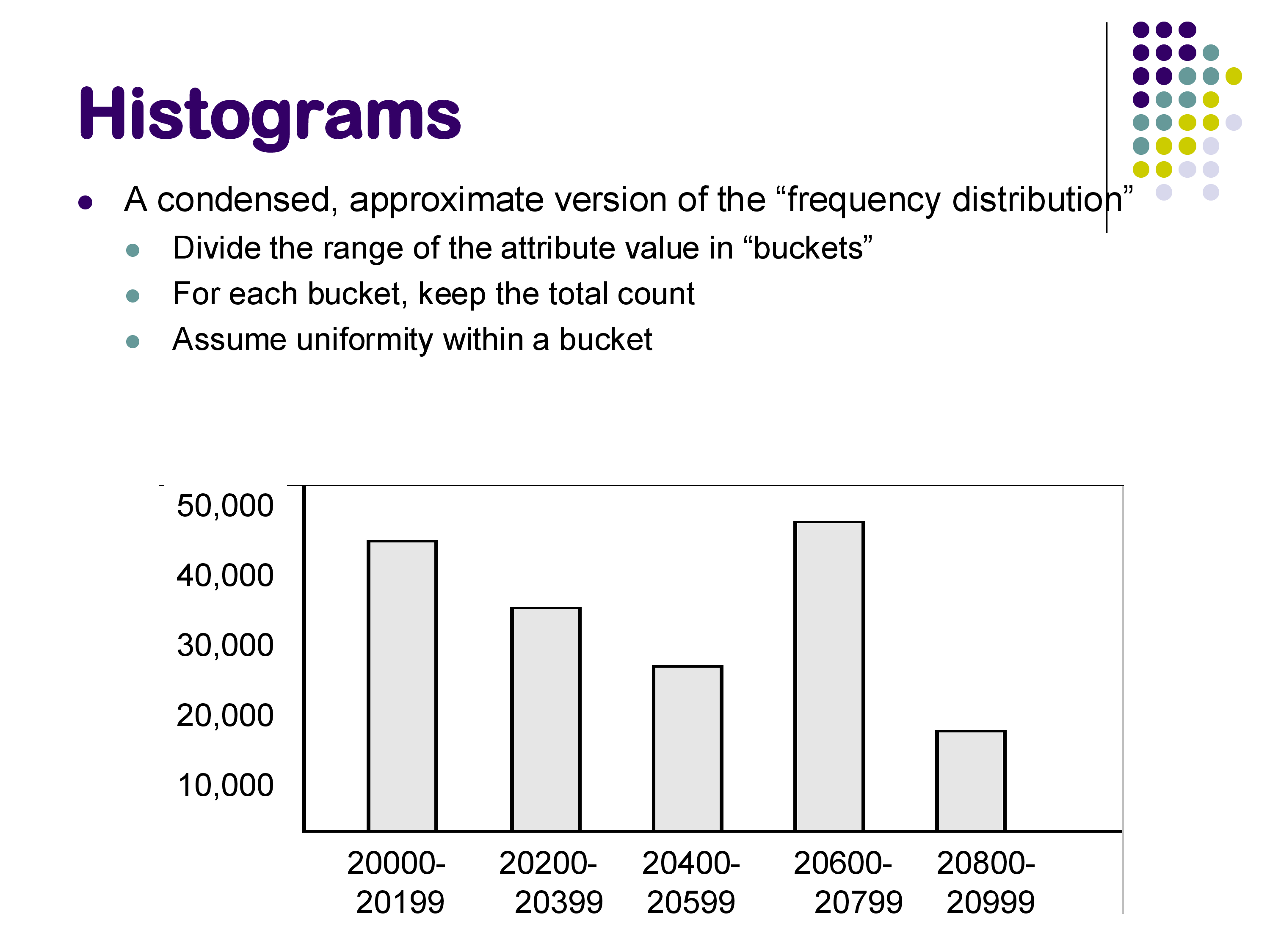Equi-depth histograms: each bucket contains the same number of tuples, but the bucket boundaries vary. PostgreSQL uses equi-depth histograms. They adapt better to non-uniform distributions: high-density regions get narrow buckets (more precise estimates there), while sparse regions get wide buckets. In the PostgreSQL pg_stats table, the histogram_bounds column stores the bucket boundaries for an equi-depth histogram on each column.