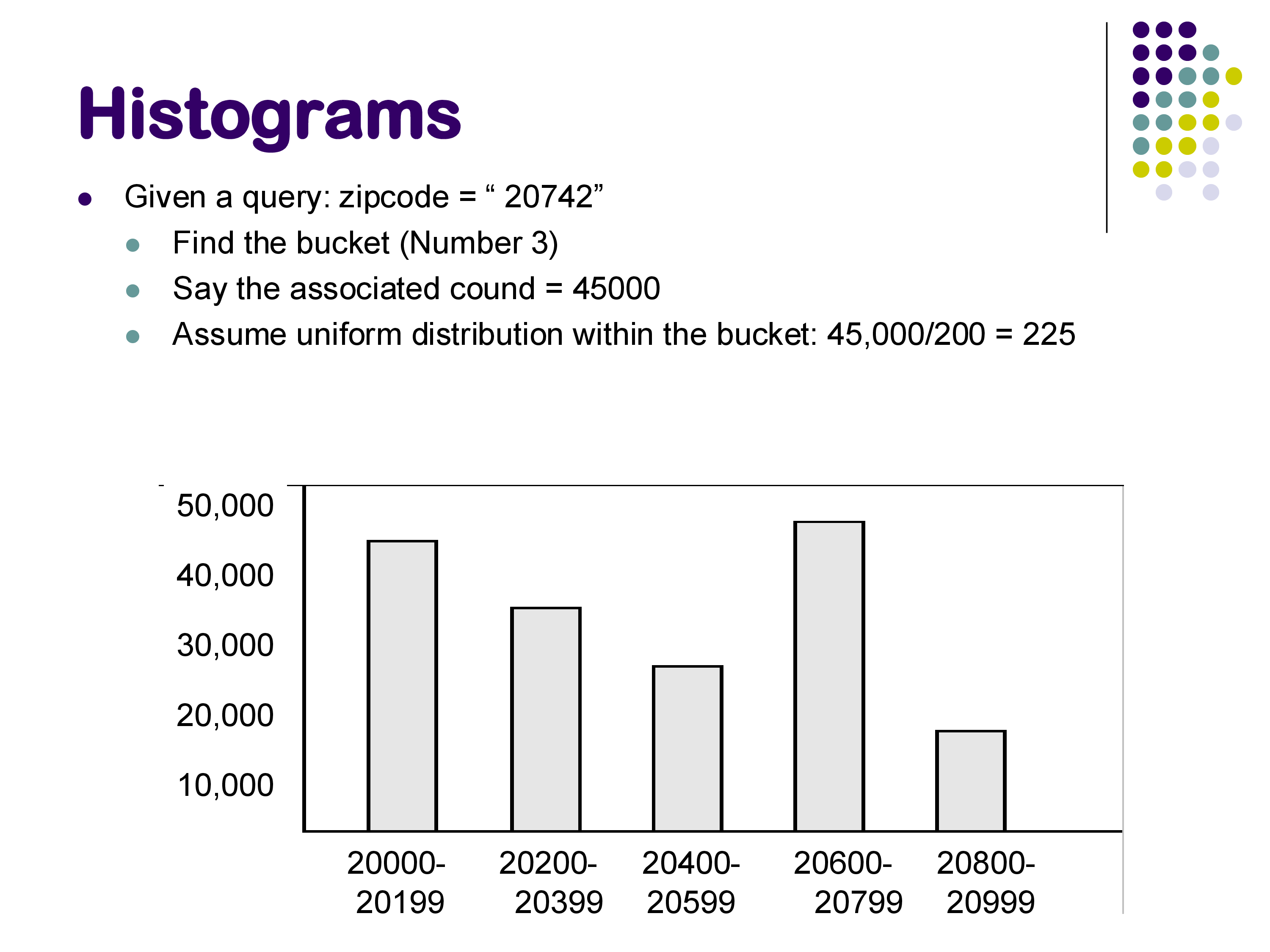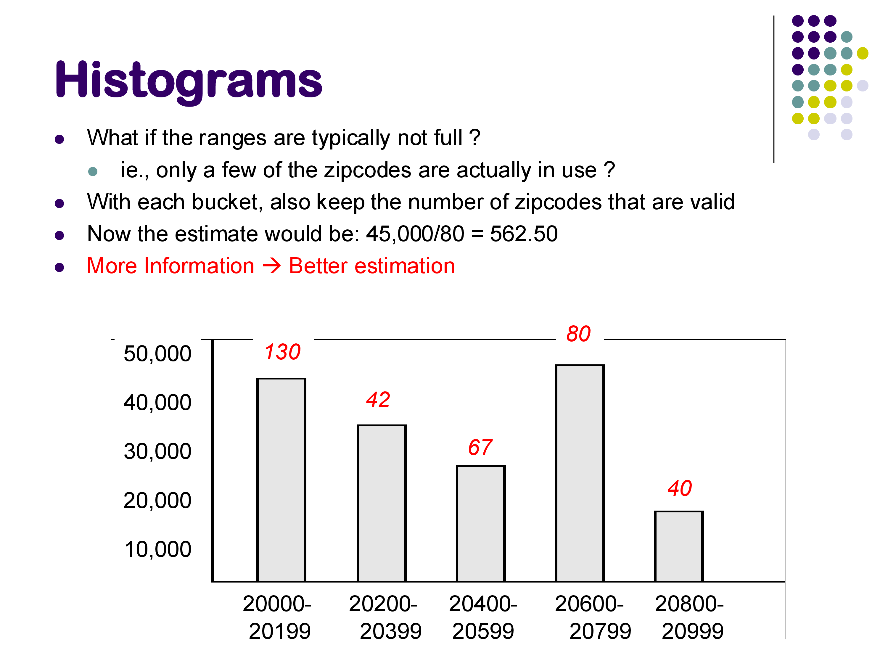 If we also track the number of distinct non-NULL values within each bucket (say, 80 distinct zipcodes in bucket 3 instead of all 200 in the range), the estimate improves: \(45000 / 80 = 562.5\) tuples — better, because it accounts for values in the range that simply don’t appear in the data.