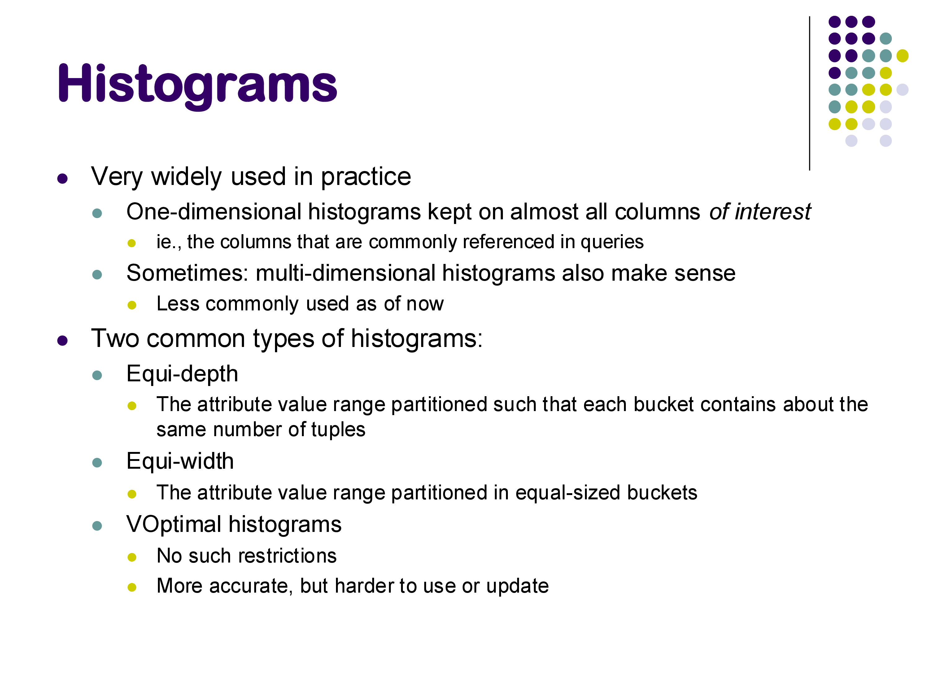 - Use histograms for more accurate range selectivity estimates — equi-width (uniform bucket ranges) or equi-depth (uniform bucket sizes, PostgreSQL’s choice).
